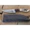 Longueur du manche 11.5cm - Longueur de la lame 11.5cm - Lame en Acier damas 256 couches - Lame de type trailing point - Construction d'une seule pièce - Full tang - Plaquettes du manche en os avec tête de cerf - Mitres en bois - Fabrication Artisanale - Les dessins de la lame sont uniques comme une empreinte - Etui simili cuir