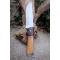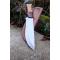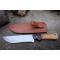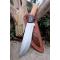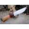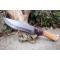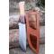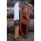 Couteau de chasse Bushcraft Survie à lame fixe - Longueur totale 30cm - Longueur de lame 18cm - Lame en acier carbone 1055 - Lame type drop point plain edge - Construction d'une seule pièce - Full tang - Plaquettes du manche en bois - Mitres en bois - Trou dans le manche pour dragonne - Etui cuir avec insert cuir façon crocodile - Fabrication artisanale