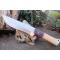 Couteau de chasse Bushcraft Survie à lame fixe - Longueur totale 31.5cm - Longueur de lame 17cm - Lame en acier carbone 1055 - Lame type drop point plain edge - Construction d'une seule pièce - Full tang - Plaquettes du manche en bois - Mitres en bois - Trou dans le manche pour dragonne - Etui cuir avec pochette - Fabrication artisanale