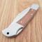 Le manche est composé de plaquettes en Wood (bois brun), complétées par des mitres en Stainless Bolster (acier inoxydable) pour une solidité accrue et une esthétique soignée. La sécurité est assurée par un mécanisme Lockback (verrouillage par pompe arrière), l'un des systèmes les plus sûrs pour éviter toute fermeture accidentelle de la lame. Il dispose également d'un trou pour lacet (Lanyard hole) à l'extrémité.