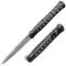 Cold Steel nous livre une version du stiletto italien sous stéroïdes, et contrairement aux versions automatiques italiennes faites dans des aciers 420 de basse qualité avec un profil de lames impossible à affûter, Cold Steel en fait un couteau utilisable avec un verrouillage de lames beaucoup plus solide et une gueule incroyable qui ne laisse pas indifférent. L'ouverture de la lame est très souple, un simple coup de poignet, une impulsion suffit à l'ouvrir. De plus, ce couteau dispose du système Emerson à ouverture en sortie de poche par friction sur le bord des vêtements.