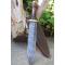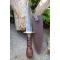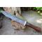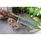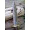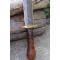 Reproduction Couteau dague de chevalier à lame fixe - Longueur totale 32.5cm - Longueur de lame 19.5cm - Lame en acier damas 256 couches - Double tranchant - Garde en laiton - Manche en bois - Etui en cuir - Fabrication artisanale