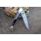 Longueur fermé 12cm - Longueur ouvert 22.50cm - Platines et mitres en laiton - Plaquettes du manche en corne - Tire bouchons - Ressort du dos guilloché avec abeille - Lame en damas 128 couches - Les dessins de la lame sont comme une empreinte, ils sont uniques - Système à cran forcé - Ouverture à 2 mains