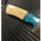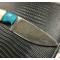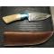Longueur totale 21,59cm. Longueur de lame 10,16cm. Lame en acier damas 256 couches. Lame construction plate semelle. Plaquettes du manche en os & turquoise. Etui en cuir marron.