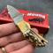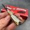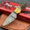 Couteau Fox-N-Hound Mini Skinner Damascus 256 Layers Stag Bone handle Leather Sheath à lame fixe - Longueur totale 10.16cm - Longueur de lame 4.44cm - Lame de type drop point plain edge - Construction d'une seule pièce - Full tang - Lame en acier damas 256 couches - Mitres en laiton - Plaquettes du manche en os façon bois de cerf - Trou dans le manche pour dragonne - Etui cuir