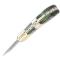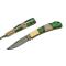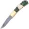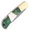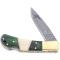 Système de sécurité lockback. Longueur fermé 10,16cm. Longueur de lame 7,62cm. Lame en acier damas 128 couches. Lame de type drop point. Mitres en laiton. Plaquettes du manche en os & bois vert. Platines guillochées. Ressort guilloché.