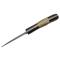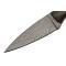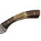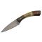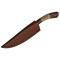 Longueur totale 17,78cm. Longueur de lame 7,62cm. Lame en acier damas 256 couches de type skinner. Lame construction plate semelle. Plaquettes du manche en bois marron et os façon bois de cerf. Etui en cuir marron.