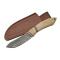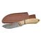 Longueur totale 19,05cm. Longueur de lame 8,89cm. Lame en acier damas 256 Couches. Lame de type skinner. Plaquettes du manche en os. Lame construction plate semelle. Trou dans le manche pour dragonne. Etui en cuir marron.