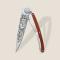 Couteau ultra léger en acier inoxydable Z40C13, finition titane gris. Lame avec cran de sécurité de type 'liner lock' décorée d'une fine gravure au laser. Clip de ceinture. Manche en Bois Corail.