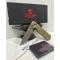 Le Dreamtech Button Lock Gold est un couteau pliant haut de gamme qui se distingue par son esthétique luxueuse et sa mécanique de précision. Sa grande lame de type Drop Point de 10.21 cm est fabriquée en Acier à Outil D2 et présente une finition Satin. Le manche est en Titane Doré (Gold Titanium), offrant un look unique et une robustesse maximale. L'ouverture se fait par Thumb Stud, et le verrouillage est assuré par le mécanisme fiable Button Lock.