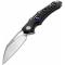 Le manche est composé de plaquettes en Manche Micarta noir (Canvas Micarta), offrant une texture organique et une adhérence supérieure, même avec des gants ou en milieu humide. D'une longueur fermée de 12,7 cm, ce couteau utilise un mécanisme Liner Lock robuste. L'ouverture est fluide et rapide grâce à l'ouverture flipper (Extended Tang) et au Thumb Pull.