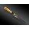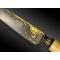 Forte lame à un tranchant, en acier damas « wootz », à décor damasquiné de fleurs, d’oiseau et de félins ; elle se termine par une virole prise dans la masse et forgée en balustre, avec un décor de damasquine présentant des fleurs ; le dos à deux registres comporte une arrête médiane, il est également décoré de damasquine d’or.