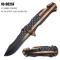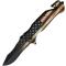 Système à ouverture assistée. Longueur fermé 15.88cm. Longueur de lame 11.43cm. Lame en acier inox finition black. Manche acier avec drapeau US. Ouverture d'une main avec le thumb & le flipper. Clip de poche. Fonction coupe ceintures & brise vitres. Couteau avec lock utilisé.