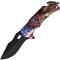 Système à ouverture assistée. Longueur fermé 12.70cm. Longueur de lame 9.53cm. Lame en acier inox finition black. Plaquettes du manche en ABS avec Drapeau. Ouverture d'une main avec le thumb hole et le flipper. Fonction coupe ceintures & brise vitres. Clip de poche.