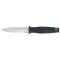 La lame, fabriquée en acier CPM-20CV avec une dureté de 60-61 HRC, présente un profil de dague à double tranchant lisse et une finition satinée, garantissant une coupe précise et durable. Le manche en Thermorun et l'étui en Zytel complètent cet outil d'exception, tandis que la fabrication à Seki-City, au Japon, témoigne de l'expertise de Fallkniven.