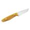 Le manche en Ultem, de couleur jaune, apporte une touche de modernité et une prise en main confortable. Les plaquettes du manche sont démontables, permettant un entretien facile et une personnalisation selon les préférences de l'utilisateur. L'étui en cuir inclus facilite le port et protège la lame lors des déplacements.