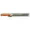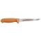 Le manche en polymère, de couleur orange, est doté d'un grip anti-dérapant, garantissant une prise en main sécurisée même dans des conditions humides. La demi-garde fixe ajoute une sécurité supplémentaire, empêchant tout glissement accidentel de la main vers la lame.