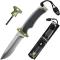Solide, puissant et polyvalent, le couteau Gerber Ultimate Survival s'inspire entièrement du couteau Ultimate Knife de Bear Grylls. Il a été pensé pour le bivouac, la survie et l'aventure. L'Ultimate offre une lame en acier inoxydable enrichi au carbone. Le tranchant de ce couteau de survie présente l'avantage d'être semi-dentelé et semi-lisse. Le manche bénéficie d'un revêtement nylon, TacHide et Rubber Grip (manche robuste et antidérapant). Il est doté d'un pommeau en acier inoxydable faisant office de marteau. Grâce à deux trous intégrés au manche, vous pouvez installer votre couteau Ultimate sur un bâton de bois ou un autre support, via de la cordelette. Ainsi, votre couteau Gerber Ultimate devient une lance. L'ensemble offre une résistance idéale pour une utilisation engagée. Longueur totale du couteau : 25 cm (manche de 13 cm et lame de 12 cm). Le poids du couteau Gerber Ultimate Survival s'élève à 235 grammes.