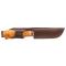 Son manche, composé de racine de bouleau, de cuir et d'inserts en acier, ajoute une touche traditionnelle et naturelle à votre équipement, tout en garantissant une prise en main confortable et ergonomique. Ce design assure également une prise ferme. La lame mesure 105 mm de long et 3,1 mm d'épaisseur, adoptant une construction stick tang pour une durabilité accrue. La lame au profil Drop Point rend ce couteau particulièrement polyvalent, adapté à une multitude d'usages.