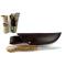 Le manche en rondelles de cuir après un petit traitement à la cire d'abeille lui rendra on étanchéité et sa patine. Pour le fourreau une petite restauration et il serra parfait, le cuir gras est de très bonne qualité. En bref un bon couteau, avec helle on ne se trompe pas sur la qualité.