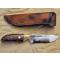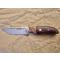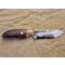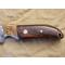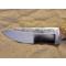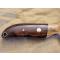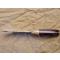 Lame en acier au carbone XC75 finition brut de forge (faite en forge à charbon), émouture plate large, tranchant rasoir. Manche en bois de fer d'Arizona avec mitre en ivoire de mammouth. Montage à plate semelle, rivet mosaïque et trou de lanière cerclé de laiton.