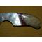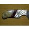 Le manche est monté par mes soins à partir de matériaux nobles: nacre, jaspe-or (de coutellerie 70% de pierre et 30% de résine afin d'éviter la friabilité du matériau, reconstituée avec un peu d'or) et corail , les différents registres étant séparés par de fins inserts en argent massif; le montage est à plate semelle sur liner de fibre noire, avec de superbes rivets mosaïque. Un étui en cuir sur mesure comlète l'ensemble.