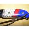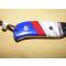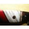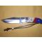 Le manche est monté par mes soins à partir de matériaux nobles: molaire de mammouth fossilisée, jaspe et lapis-lazuli (de coutellerie 70% de pierre et 30% de résine afin d'éviter la friabilité du matériau); ces matériaux précieux sont séparés par des intercalaires de liner fibre noire, la séparation avec les mitres acier est assurée par des inserts mosaïque bois. Le montage est à plate semelle, collé-vissé sur liner fibre rouge, avec des vis-rivets acier laiton. Trou de lanière et lanière cuir avec arrêtoir en bois de cerf.
