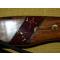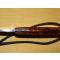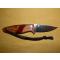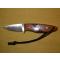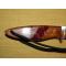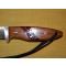 Le manche est monté par mes soins à partir de matériaux nobles: bois de fer d'Arizona et jaspe-or (de coutellerie 70% de pierre et 30% de résine afin d'éviter la friabilité du matériau; la pierre a été reconstituée avec de l'or, ce qui donne de très belles marbrures dorées); ces matériaux précieux sont séparés par des intercalaires de liner fibre noire. Le montage est à plate semelle sur liner fibre noire, avec des rivets "loveless" acier-laiton. Trou de lanière, lanière en paracorde.