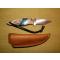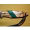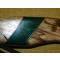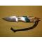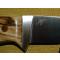 Le manche est monté par mes soins à partir de matériaux nobles: hêtre stabilisé et malachite (de coutellerie 70% de pierre et 30% de résine afin d'éviter la friabilité du matériau); ces matériaux précieux sont séparés par des intercalaires de liner fibre noire. Le montage est à plate semelle sur liner fibre noire, avec des rivets "loveless" acier-laiton. Trou de lanière, lanière en paracorde.