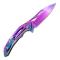Couteau Third "K1938", lame avec "flipper", mécanisme "ball bearing" et cran intérieur, manche à trous inox. Finition "arc-en-ciel".