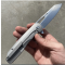 Longueur ouvert 20.21cm - Longueur fermé 11,43cm. Longueur de lame 8,89cm. Epaisseur de lame 4mm. Lame en acier CPM S35VN (Dureté 59 61HRC) finition satin. Lame de type Wharncliffe plain edge. Affutage flat. Lame montée sur pivot avec roulements à billes céramique(Ceramic ball bearing). Plaquettes du manche en Titanium/Fibre de carbone couleur black/gray. Ouverture d'une main avec le thumb hole & le flipper. Système de sécurité framelock. Clip de poche en titane.