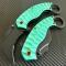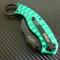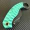 Le manche est composé de plaquettes en Aluminum aéronautique, à la fois léger et extrêmement résistant, arborant une finition Turquoise texturée pour un grip efficace. La structure ergonomique est complétée par l'emblématique Finger Ring (anneau de sécurité) au pommeau, garantissant que le couteau reste solidaire de la main lors des manipulations. Il est équipé d'un Pocket clip (clip de poche) noir pour un port sécurisé.