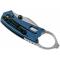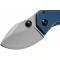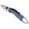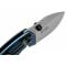 Le manche est fabriqué en Acier inoxydable avec un revêtement PVD bleu élégant et résistant. Son design unique intègre un large anneau à la base, permettant une prise en main ultra-sécurisée (style karambit) et servant également de tournevis plat ou de mini levier (pry-bar). À l'intérieur de cet anneau, une extension du manche fait office de décapsuleur pratique. Le verrouillage est assuré par un système Frame Lock robuste. Compact et ingénieux, l'Antic se glisse facilement en poche grâce à son clip (port tip-down) et se déploie via un ergot de pouce (thumb stud).