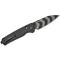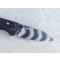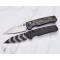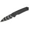 Lame Drop Point en acier CPM MagnaCut (dureté estimée : 60-62 HRC) avec finition camo tiger stripe noir et gris.