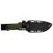 Le manche en polypropylène avec revêtement en caoutchouc, dans une élégante teinte olive, assure une prise en main confortable même dans des conditions humides. Pour le transport, l'étui moulé en nylon renforcé de fibre de verre (FRN) offre une protection solide. Il est doté de fentes pour sangles, d'un trou de drainage et d'une sangle de ceinture amovible, garantissant que votre équipement reste prêt à l'emploi.