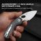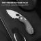 La Lame Acier 14C28N de 5,11 cm adopte un profil Drop Point avec une finition Satin. Cet acier Sandvik de haute qualité est traité pour atteindre une dureté de 58-60 HRC, offrant un excellent tranchant initial et une grande facilité d'entretien sur le terrain. L'ouverture est fluide et rapide grâce au Thumb Hole (trou de pouce) monté sur roulements à billes.