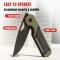 Ce couteau pliant compact est équipé d'une lame en acier Nitro-V de haute qualité, offrant une excellente tenue de coupe et une résistance à la corrosion. La lame Drop Point de 7,16 cm et d'une épaisseur de 2,5 mm assure une coupe précise et efficace. Le manche en G10 vert avec des incrustations en Micarta noire offre une prise en main confortable et un style élégant.