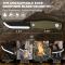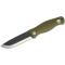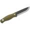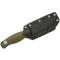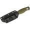 Le manche de 11,9 cm est fabriqué en G10 vert, un matériau composite léger et extrêmement durable, offrant une prise en main sûre et confortable même dans des conditions humides ou froides. La construction full tang assure une intégrité structurelle maximale, et le design ergonomique, avec un jimping agressif sur le dos de la lame et un choil profond, permet un contrôle précis. Un divot pour l'arc de forage sur le manche offre une solution pratique pour l'allumage de feu par friction.