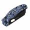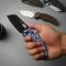 Le manche est une véritable pièce maîtresse, composé de plaquettes en Manche Micarta de couleur Blue Vortex, un motif tourbillonnant bleu et noir offrant un aspect visuel unique et une prise en main texturée irréprochable. Ce modèle intègre le système de verrouillage Button Lock, permettant un déverrouillage rapide, fluide et sécurisé d'une seule main. L'ouverture est facilitée par le Thumb Hole (trou de pouce) monté sur des roulements à billes en céramique pour une action instantanée.