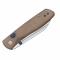 Le manche est composé de plaquettes en Manche Micarta de couleur Brune (Norplex UltreX), un matériau composite haute performance offrant un toucher texturé très agréable et une prise en main sûre, même humide. D'une longueur totale de 17,78 cm (10,16 cm fermé), ce couteau innove avec son système de verrouillage Button Liner Lock : la fiabilité d'un liner-lock avec le confort d'un bouton poussoir pour la fermeture. L'ouverture est d'une fluidité parfaite grâce aux roulements à billes et s'active via le Thumb Stud (ergot de pouce).