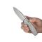 Le Bluff est un couteau pliant idéal pour un usage quotidien (EDC), conçu par Garet Caronna. Il allie une conception robuste à un poids léger, grâce à son manche en titane gris durable. Sa lame de type Drop Point est fabriquée en acier M390, un acier de haute performance reconnu pour sa résistance exceptionnelle à la corrosion et son excellente conservation du tranchant. La dureté de l'acier est de 60-62 HRC. La lame présente un fini Beadblast et est montée sur des rondelles en bronze phosphoreux, garantissant une action fluide. Le mécanisme de verrouillage Crossbar Lock offre une sécurité fiable et est ambidextre.