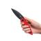 Le manche de 10,1 cm de long (3,98 pouces) est en G10 rouge, un matériau composite léger et extrêmement durable, offrant une prise en main exceptionnelle grâce à sa texture. Son épaisseur de 1,4 cm (0,55 pouce) assure une ergonomie confortable et sécurisée.