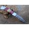 Longueur fermé 10cm - Longueur ouvert 18cm - Platines & mitres du manche en nickel - Plaquettes du manche bois & os - Ressort du dos guilloché - Lame en damas 128 couches - Dos de la lame guilloché - Les dessins de la lame sont comme une empreinte, ils sont uniques - Sécurité lockback - Ouverture à 2 mains