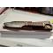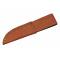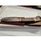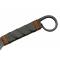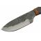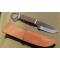 Le manche est enveloppé de cuir noir, offrant une prise en main confortable et antidérapante. L'anneau intégré au manche améliore la sécurité lors de l'utilisation. Le couteau est livré avec un étui en cuir marron adapté pour un port pratique à la ceinture.