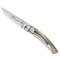L'acier inoxydable X50CrMoV15 est un matériau très qualitatif qui assure un excellent tranchant, et un réaffûtage très facile. Cette remarquable idée cadeau se transporte très facilement. Son design simple et élégant entre le bois et l'acier plaira à coup sûr à tout le monde. Le manche de ce couteau mesure 10,5 cm et est en Corne Claire. Il possède un clip pour l'accrocher sur une poche de pantalon. Il faut savoir qu'en position fermée, la lame entièrement plate du côté du manche reste apparente.