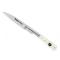 Couteau « VENDETTA CORSA » par Le Fidèle, lame acier inox 12C27 dos guilloché, manche 12,5 cm os blanc avec gravure tête de maure, mitre inox, ressort guilloché.