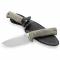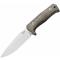 Le manche de 12,4 cm est sculpté à partir d'une seule pièce de Micarta Canvas vert, offrant une prise en main ergonomique et extrêmement robuste. Les écailles sont profilées pour un confort optimal. La lame est intégrée solidement dans le manche par un emboîtement, assurant une construction monobloc d'une grande solidité. La colonne vertébrale est chanfreinée à l'avant et intègre une encoche pour le pouce/une zone de frappe pour firesteel, augmentant la polyvalence du couteau.