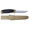 Couteau Mora Companion série adventure à lame fixe en acier inoxydable. Nouvelle série de couteaux companion avec des couleurs différentes. Manche noir/sable au toucher très agréable et anti-dérapant. Etui rigide en polymère de couleur sable avec passant de ceinture. Fabriqué en Suède. Caractéristiques: Longueur de la Lame : 10,3 cm Longueur Totale : 22 cm Epaisseur de la lame : 2,5 mm Poids du Couteau : 116 g