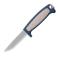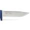 Lame en acier suédois 12C27 dureté 57HRC, manche bleu et blanc.