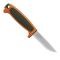 Lame en acier suédois 12C27 dureté 57HRC, manche orange/vert.